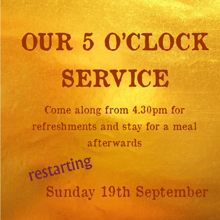 We are so very pleased and excited to welcome everyone back to the planned 5 O’Clock Service on Sunday 19th September 2021.